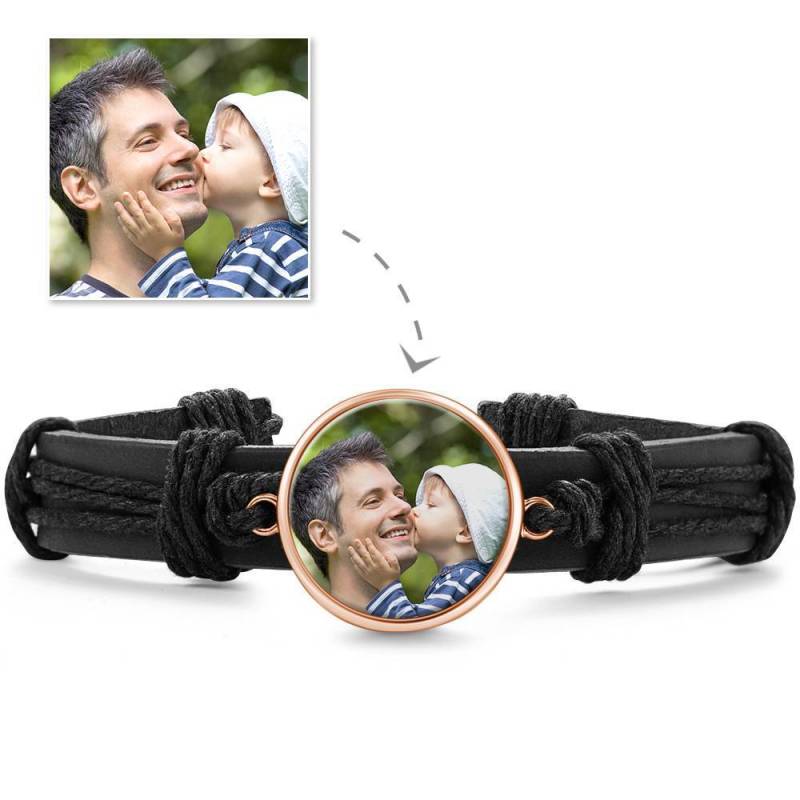Colorful Black Leather Round-shaped Photo Bracelet Rose Gold Plated
