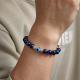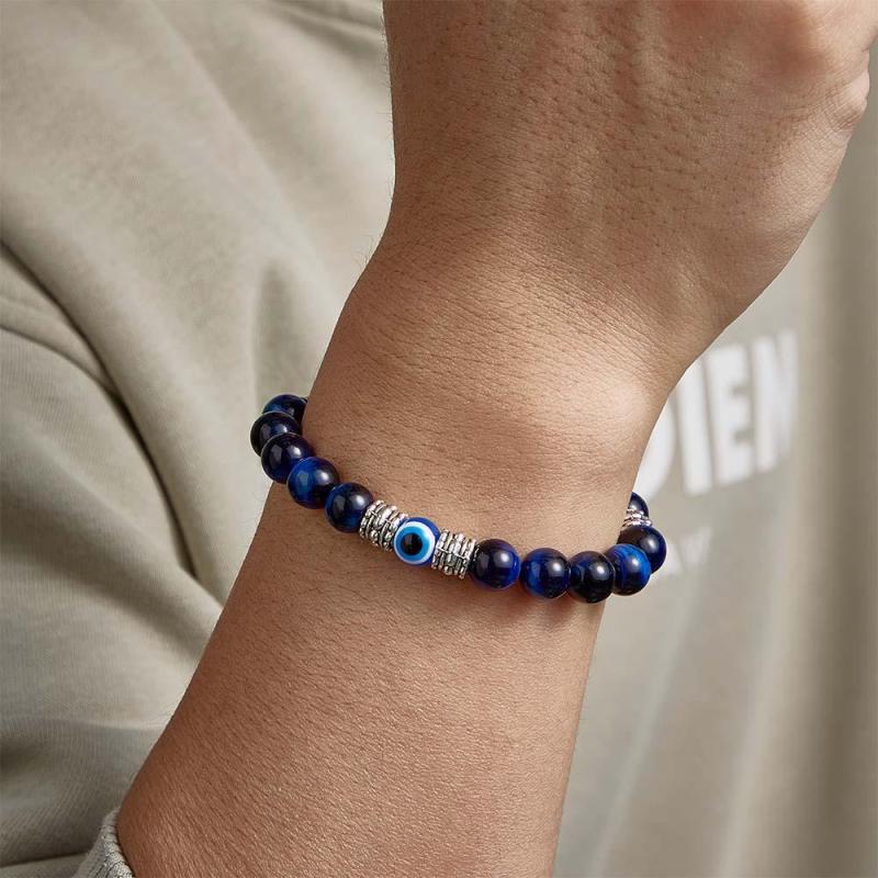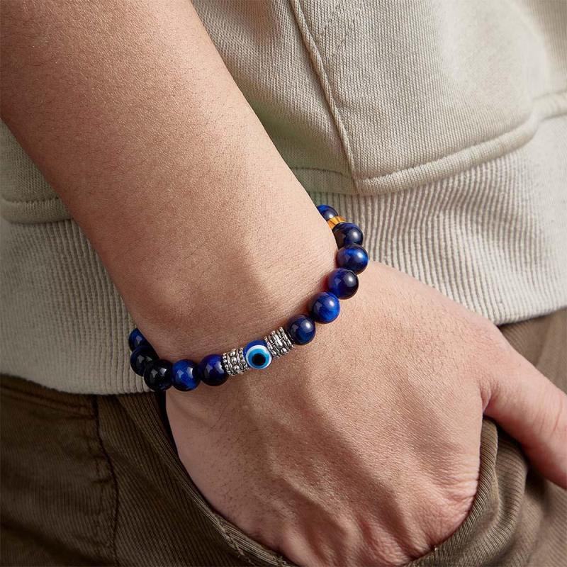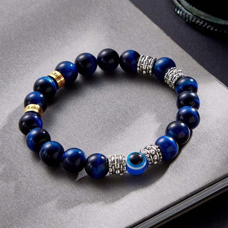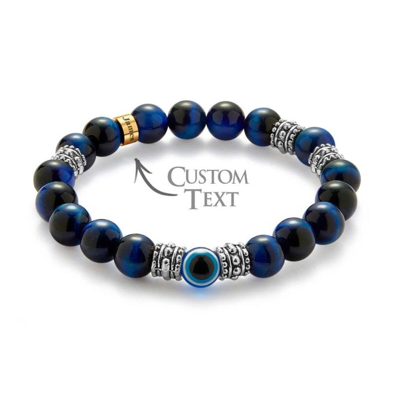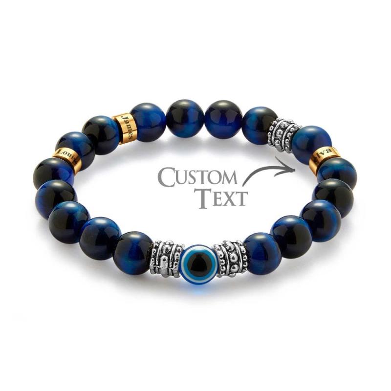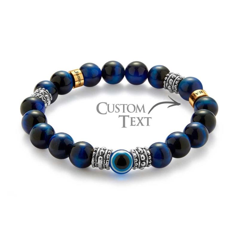 Custom Engraved Men's Beaded Bracelet Evil Eye Blue Tiger Eye Amulet Bracelet