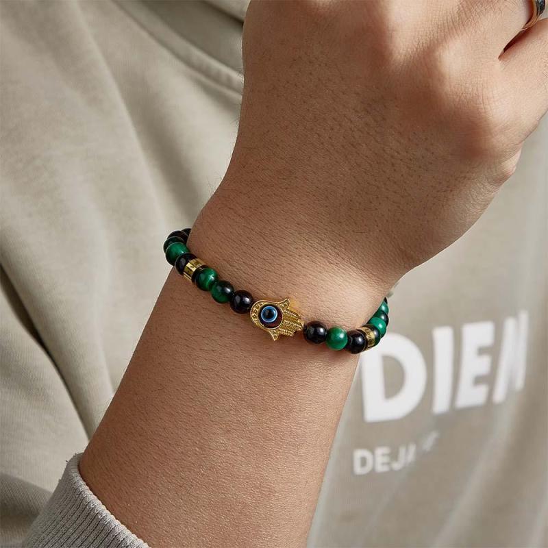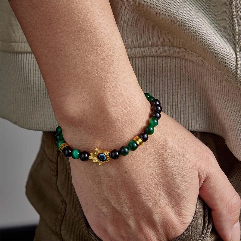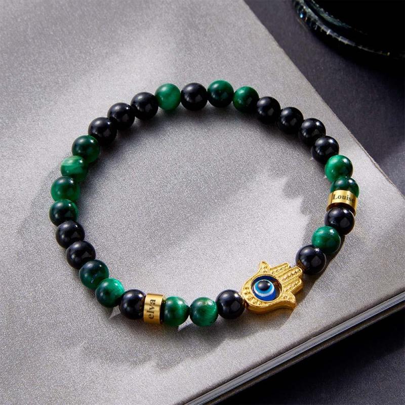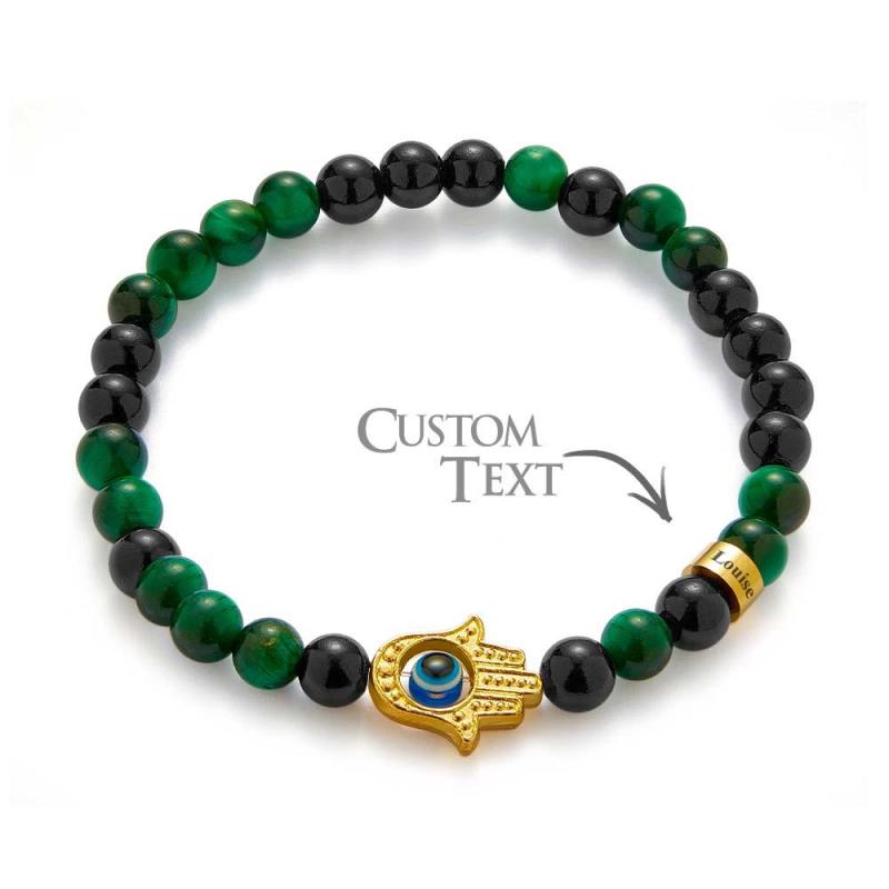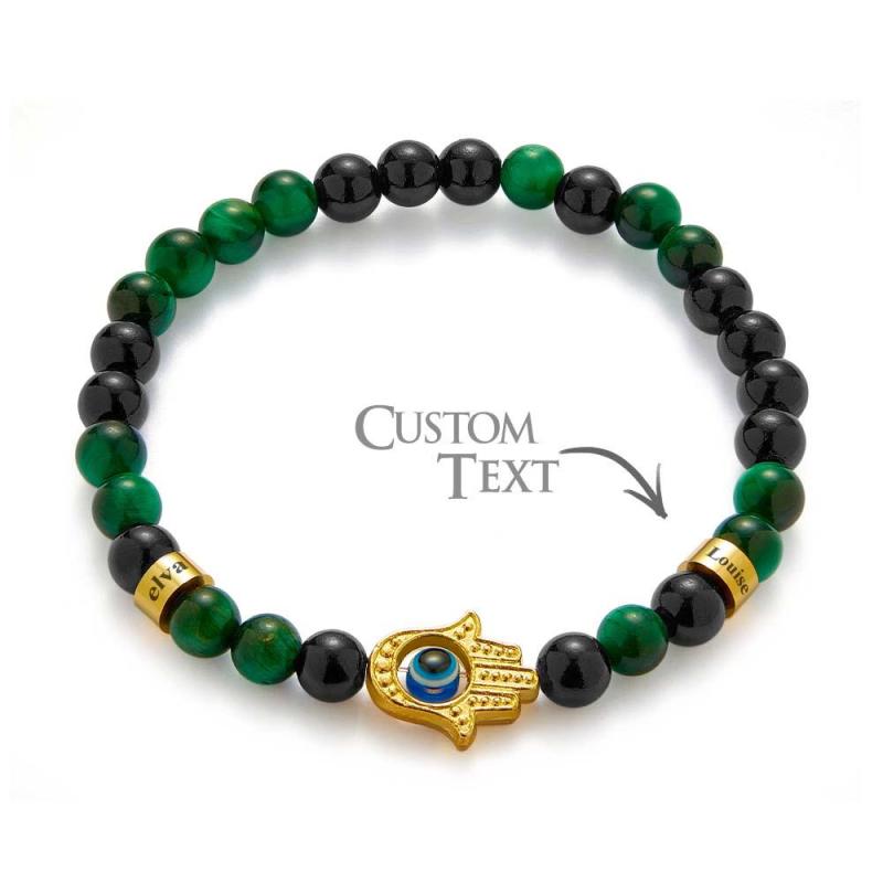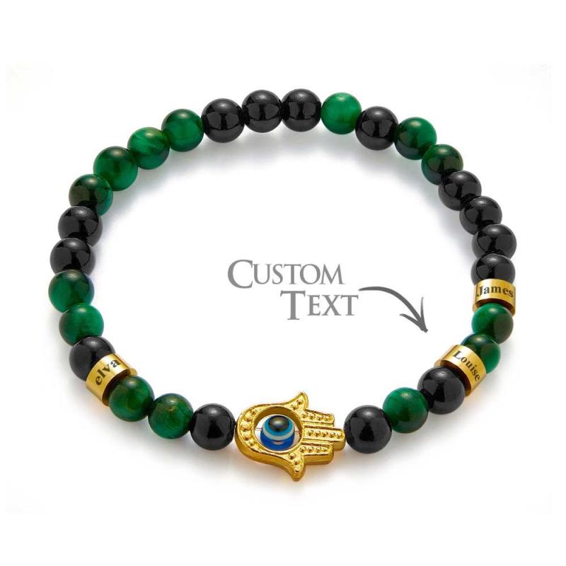 Custom Engraved Men's Amulet Bracelet Evil Eye Hamsa Green Tiger Eye Beaded Bracelet