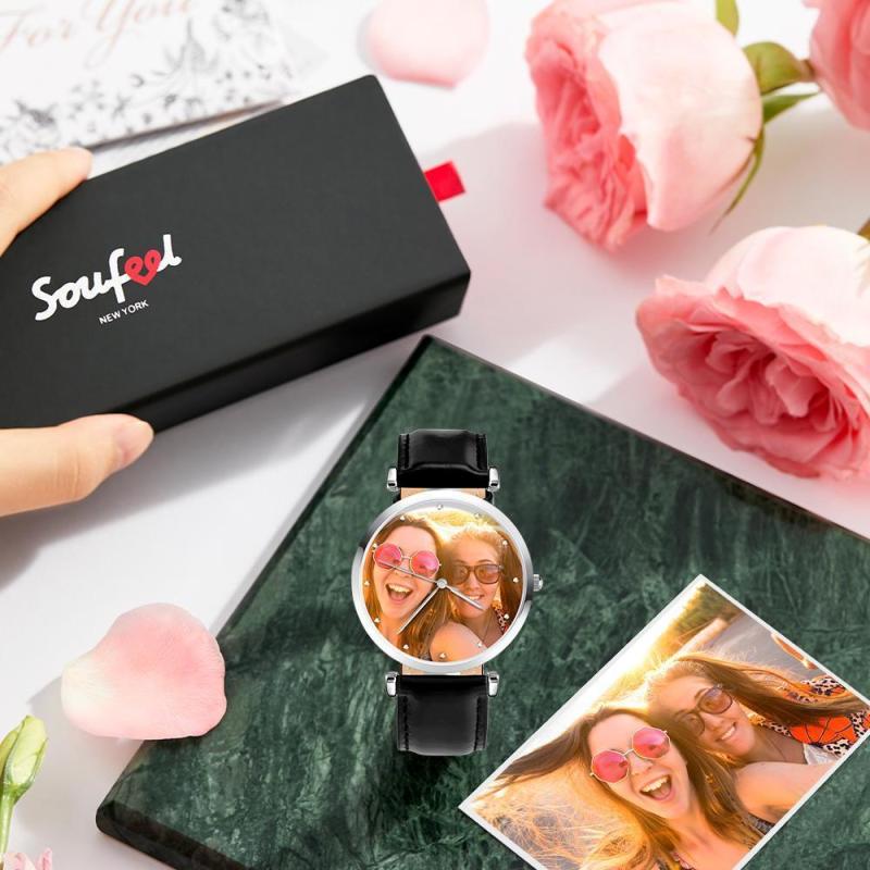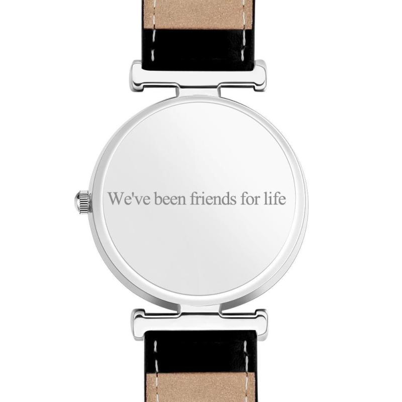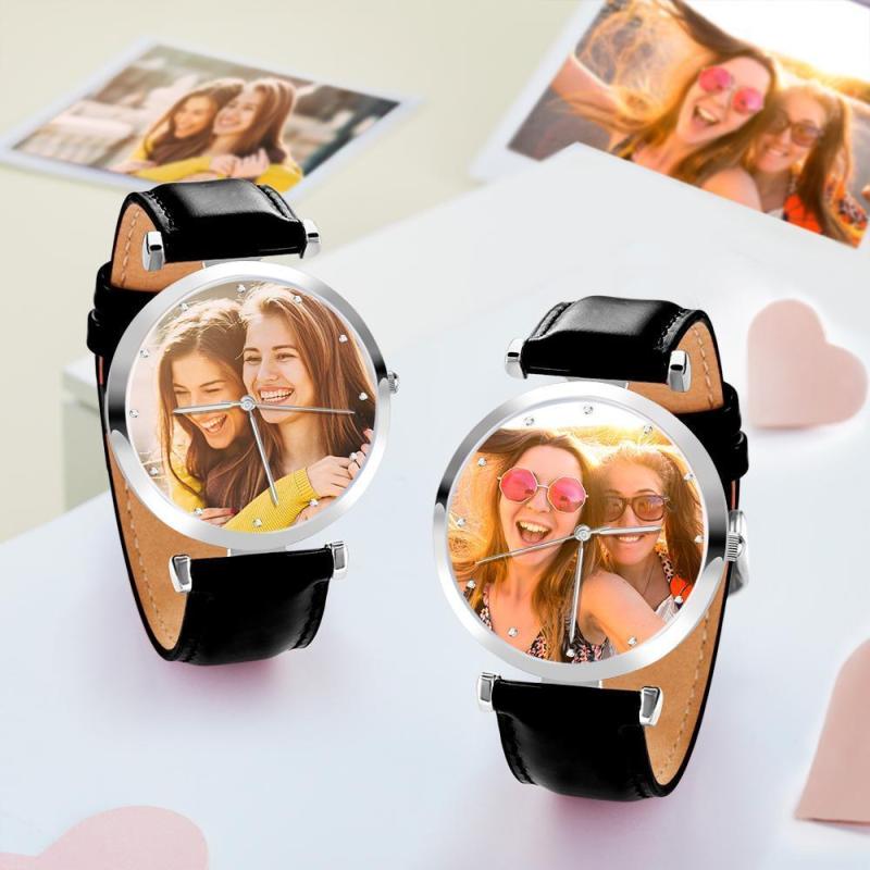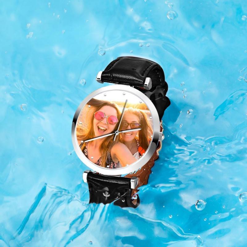 Custom Photo Engraved Watch Black Leather Strap Unique Gifts Men‘s
