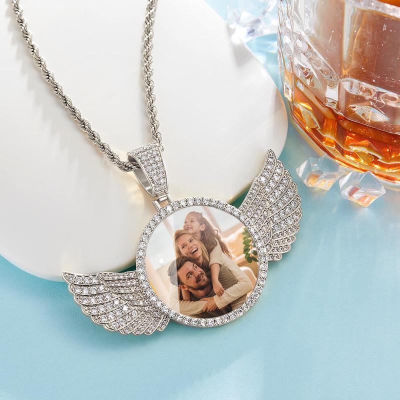 Custom Photo Necklace with Wing Medallions Pendant Jewelry Gift with Angel Wings Silver