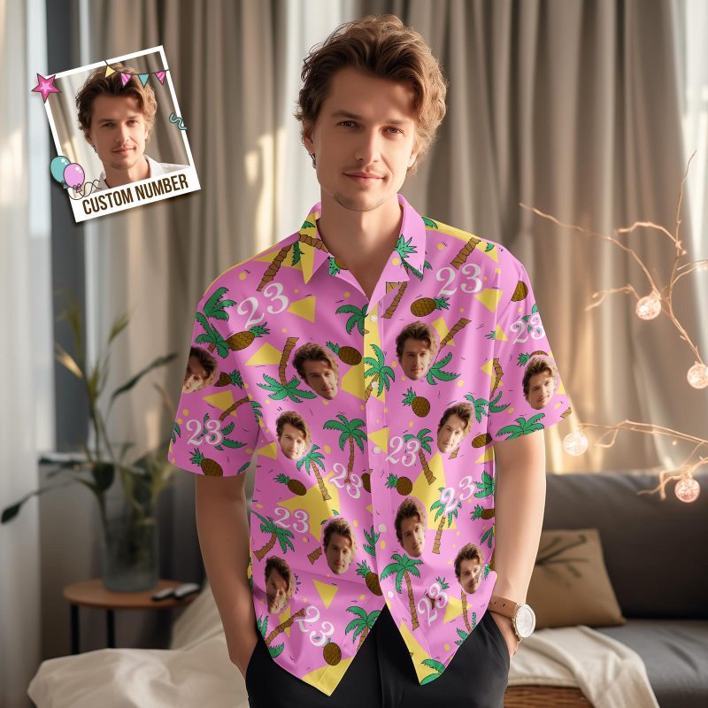 Custom Multi-color Face and Numbers Hawaiian Shirt Coconut Tree and Pineapple Gift for Men