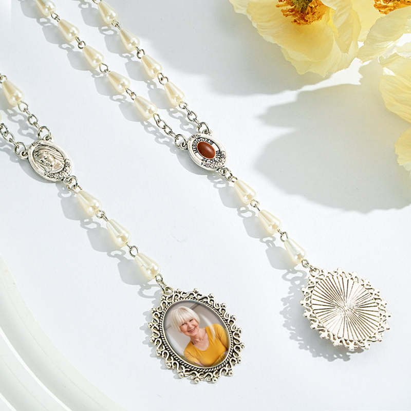 Custom Rosary Beads Cross Necklace Personalized Pearl Style Necklace with Photo