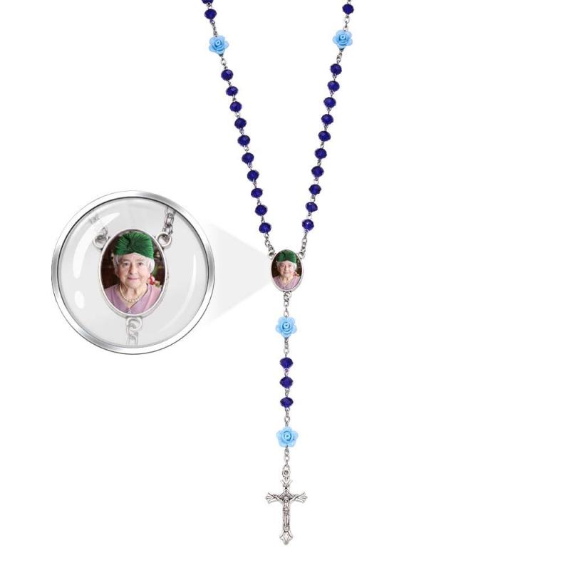 Custom Rosary Beads Cross Necklace Personalized Rose Crystal Necklace with Photo