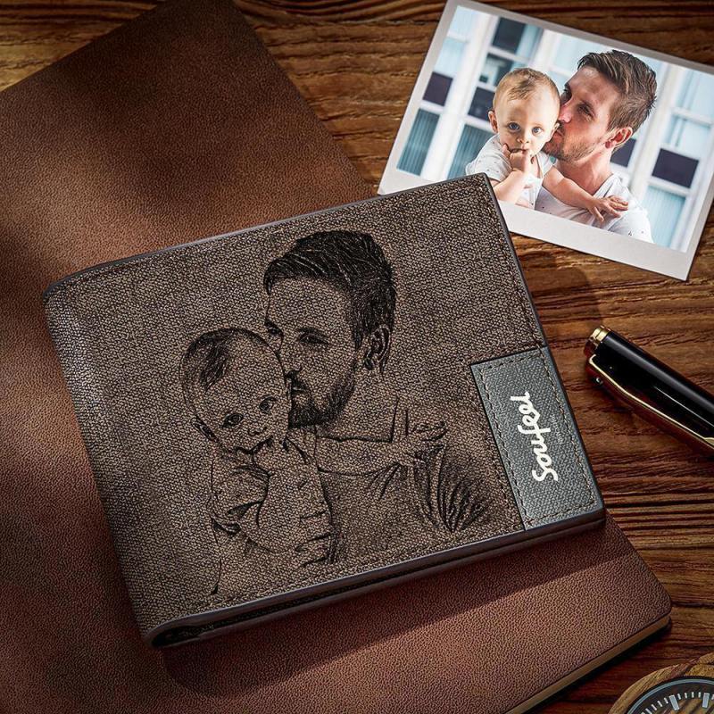 Men's Bifold Custom Inscription Photo Engraved Wallet - Coffee Leather