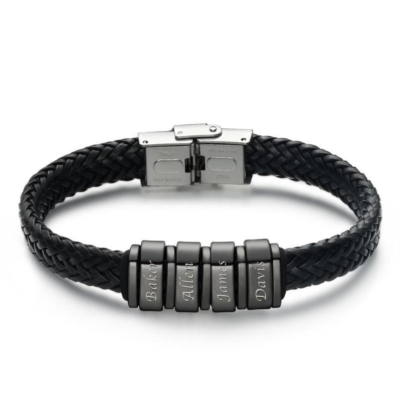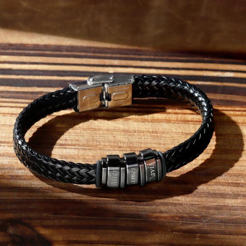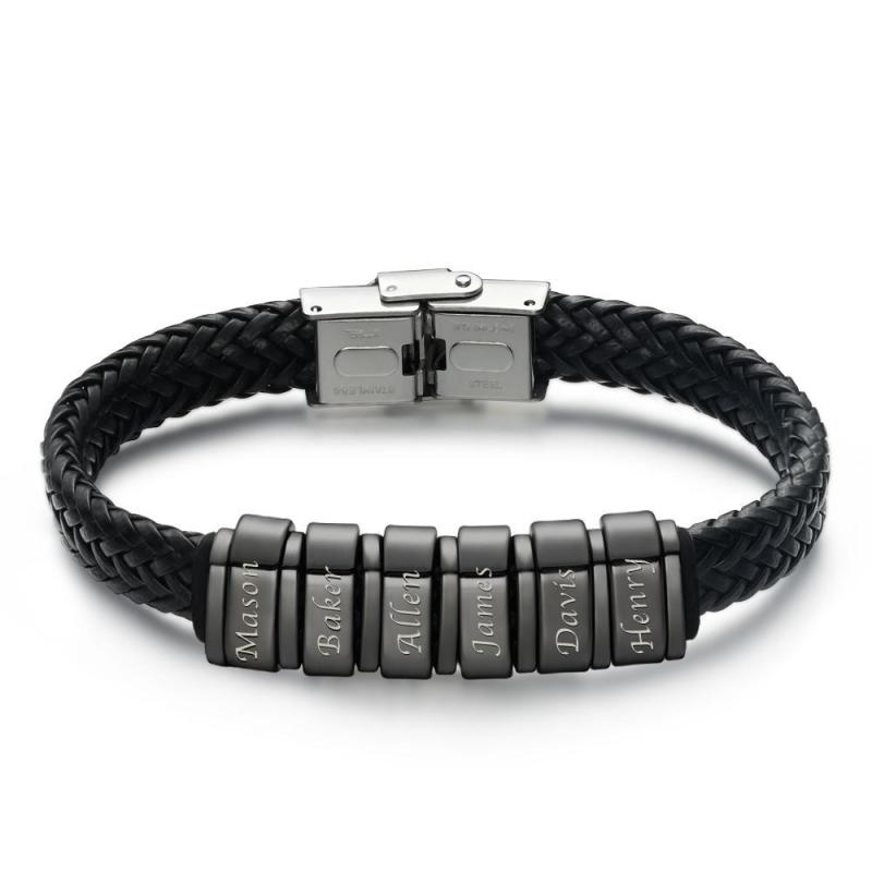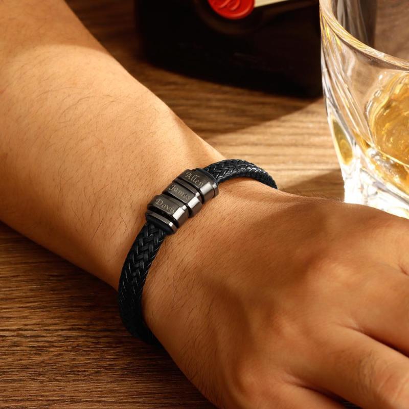 Men's Leather Bracelet Personalized Bracelet for Men, Gift for Dad Kids Name Bracelet 1-6 Charms