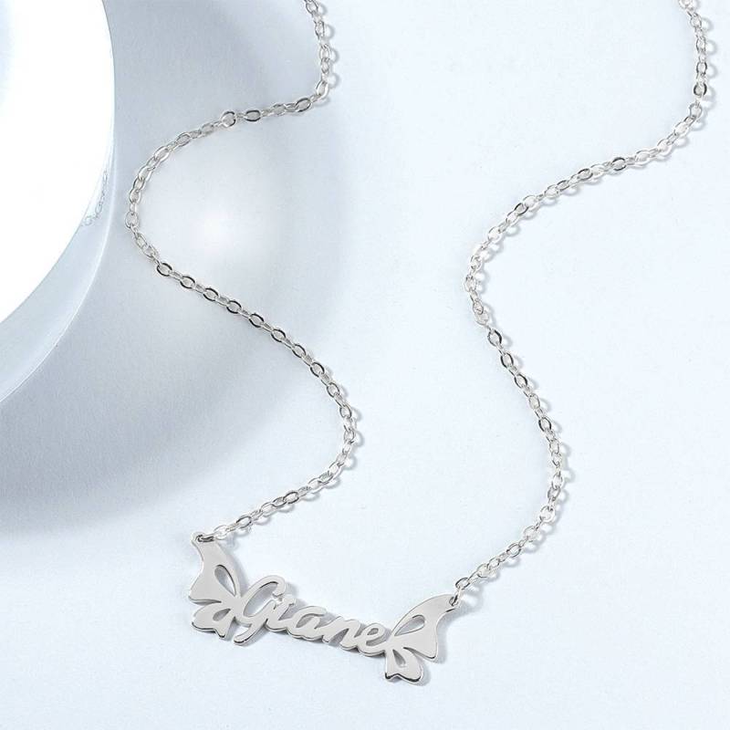 Personalized Name Necklace, Butterfly Necklace - Silver