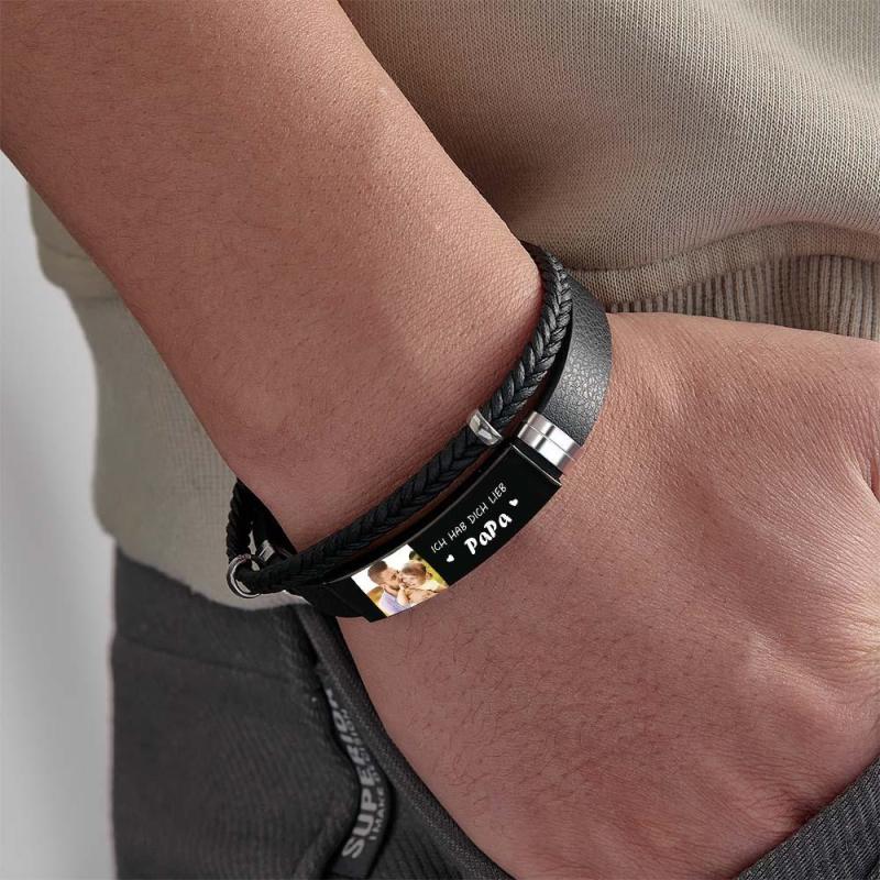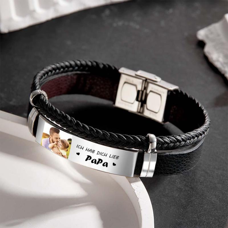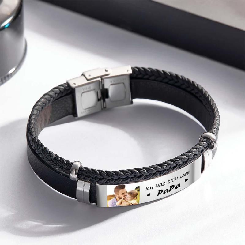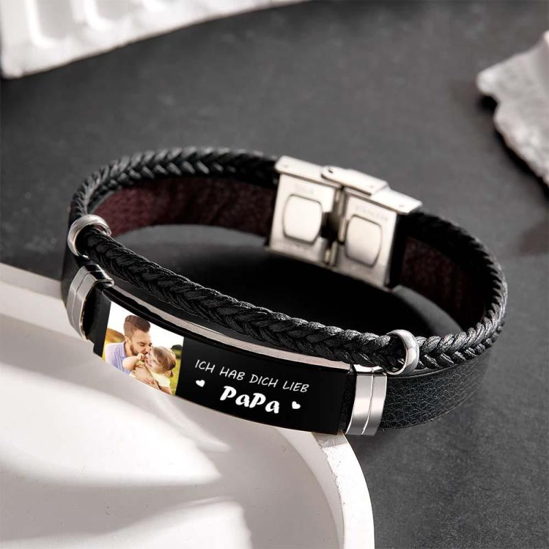 Personalized Photo Leather Bracelet With Text Braided Bangle Father's Day Gifts