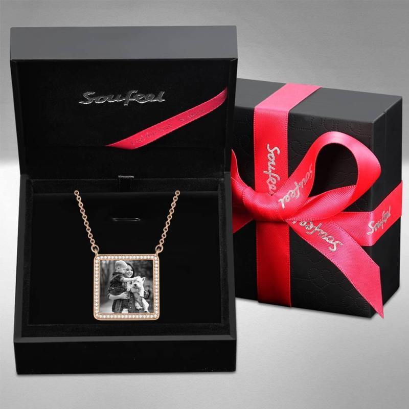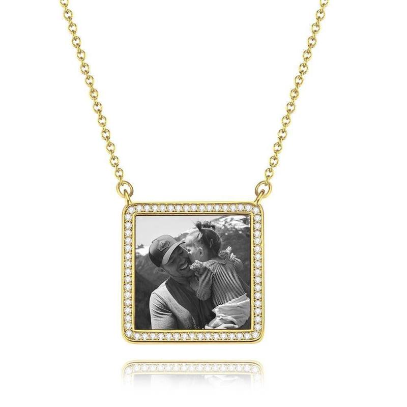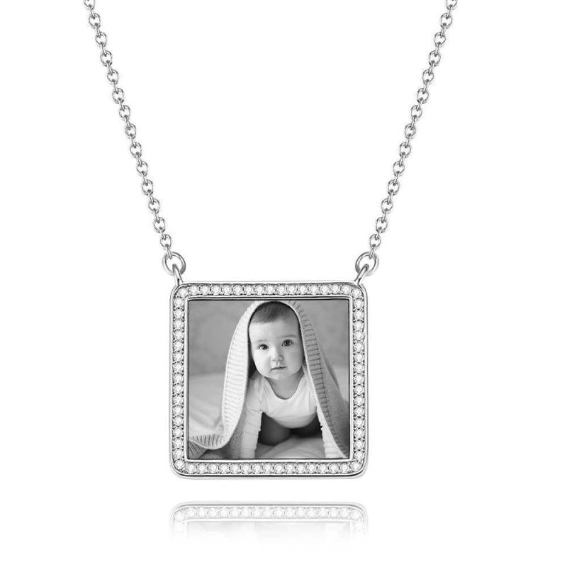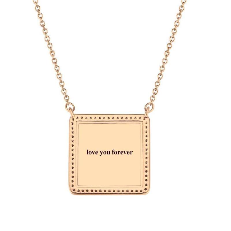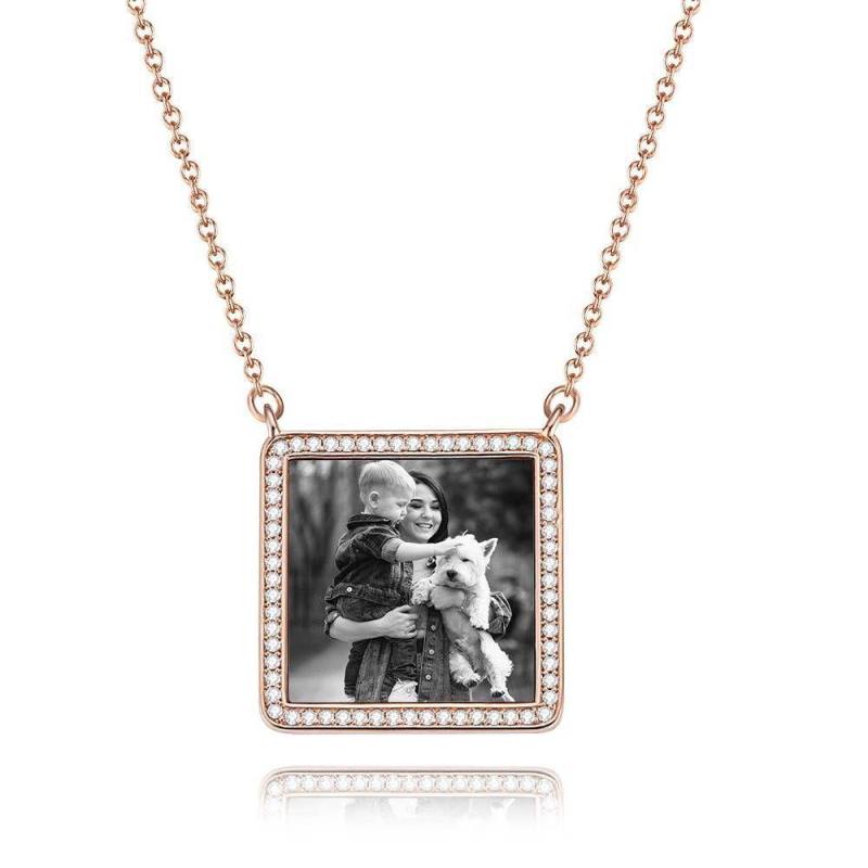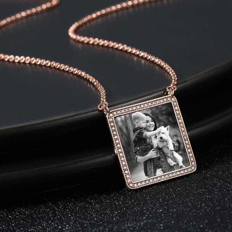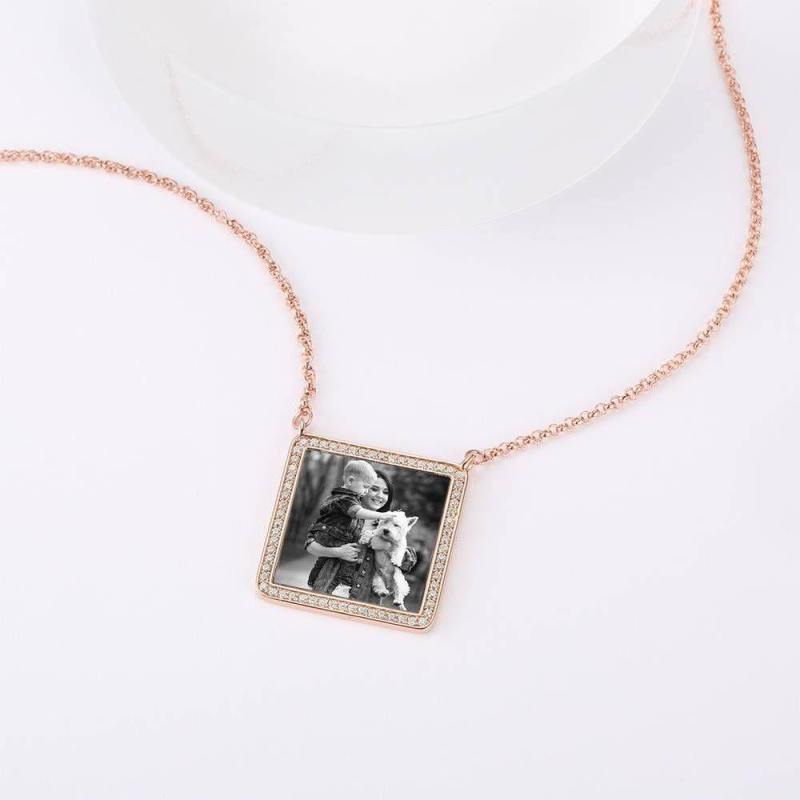 Photo Engraved Necklace Rhinestone Crystal Square Shape Unique Necklace Rose Gold Plated - Photocopying