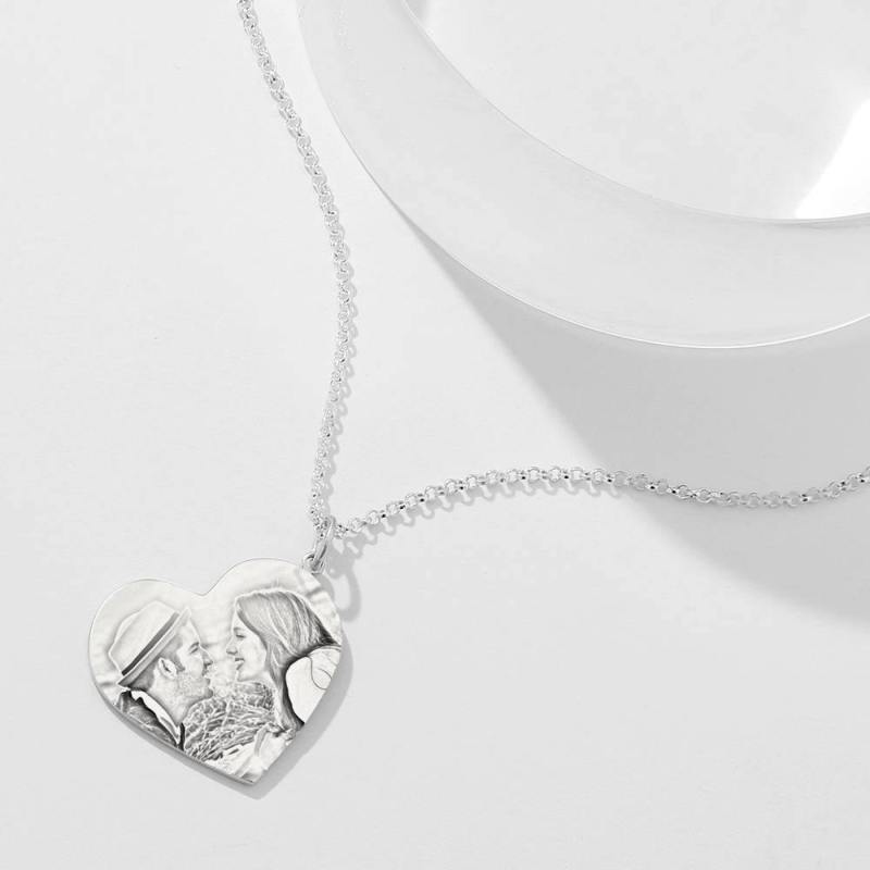 Women's Vertical Heart Photo Engraved Tag Necklace Silver