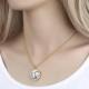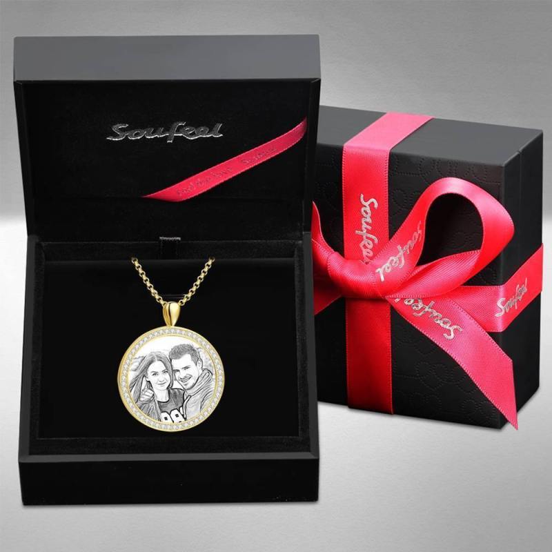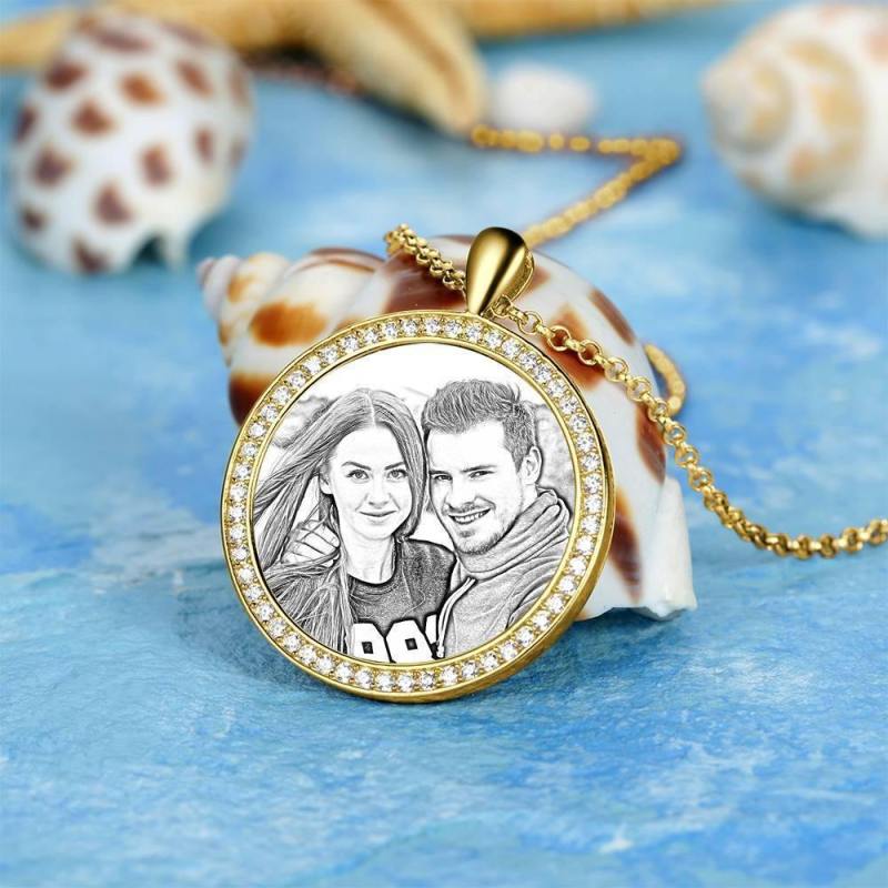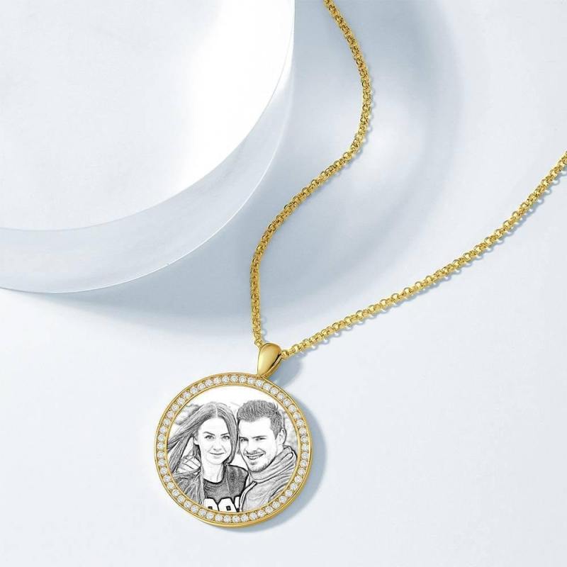 Women's Personalized Photo Engraved Necklace, Rhinestone Crystal Round Shape Photo Necklace 14K Gold Plated Golden - Sketch
