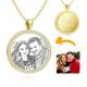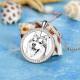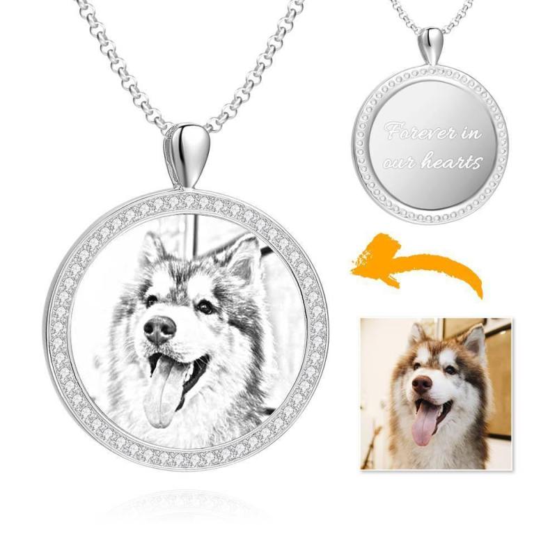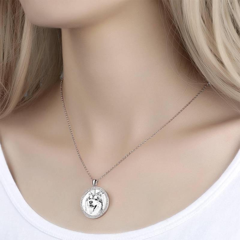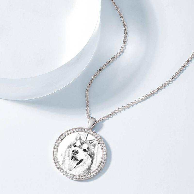 Women's Personalized Photo Engraved Necklace, Rhinestone Crystal Round Shape Photo Necklace Platinum Plated Silver - Sketch