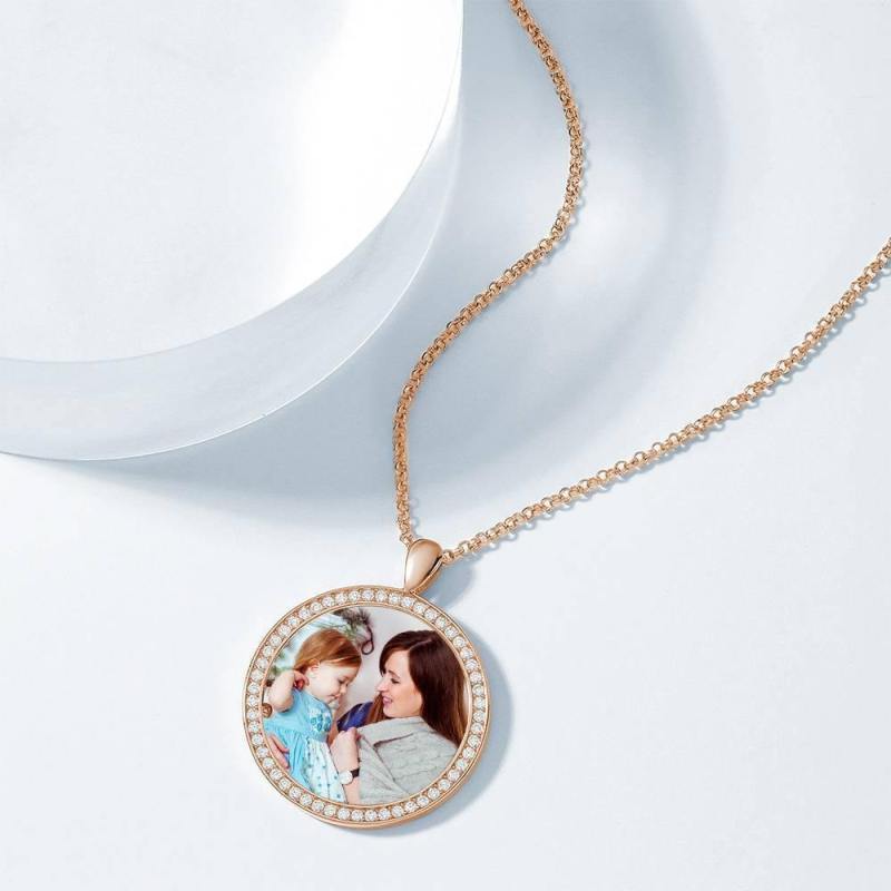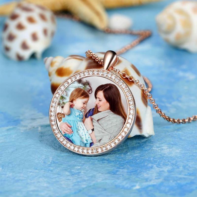 Women's Personalized Photo Engraved Necklace, Rhinestone Crystal Round Shape Photo Necklace Rose Gold Plated - Colorful