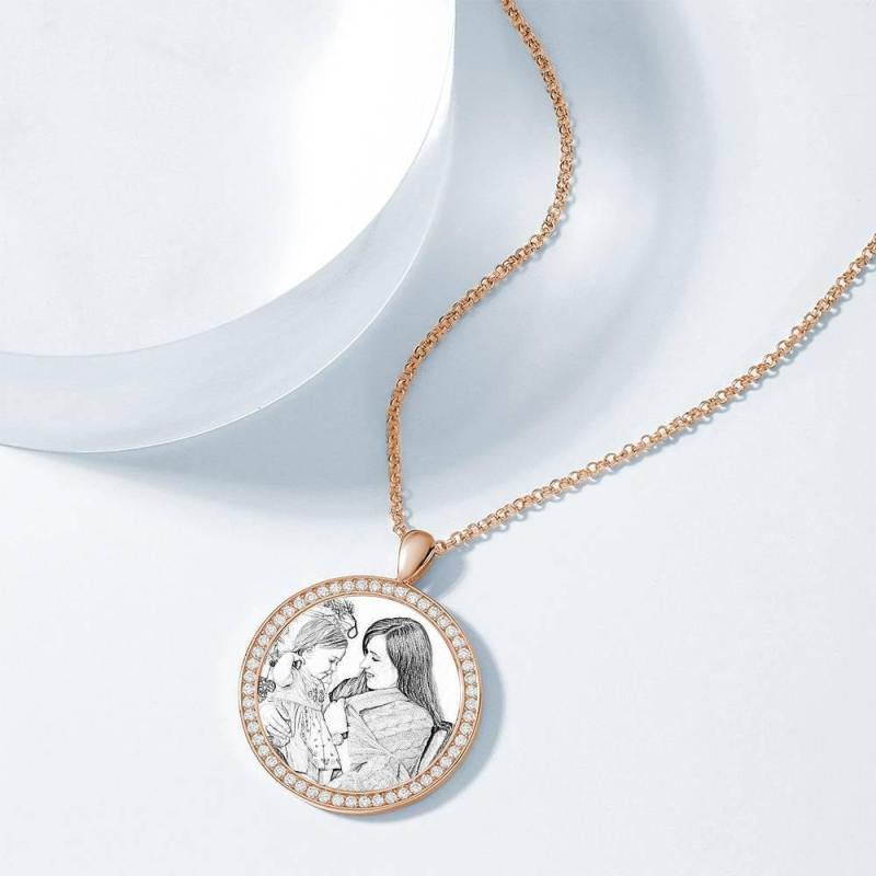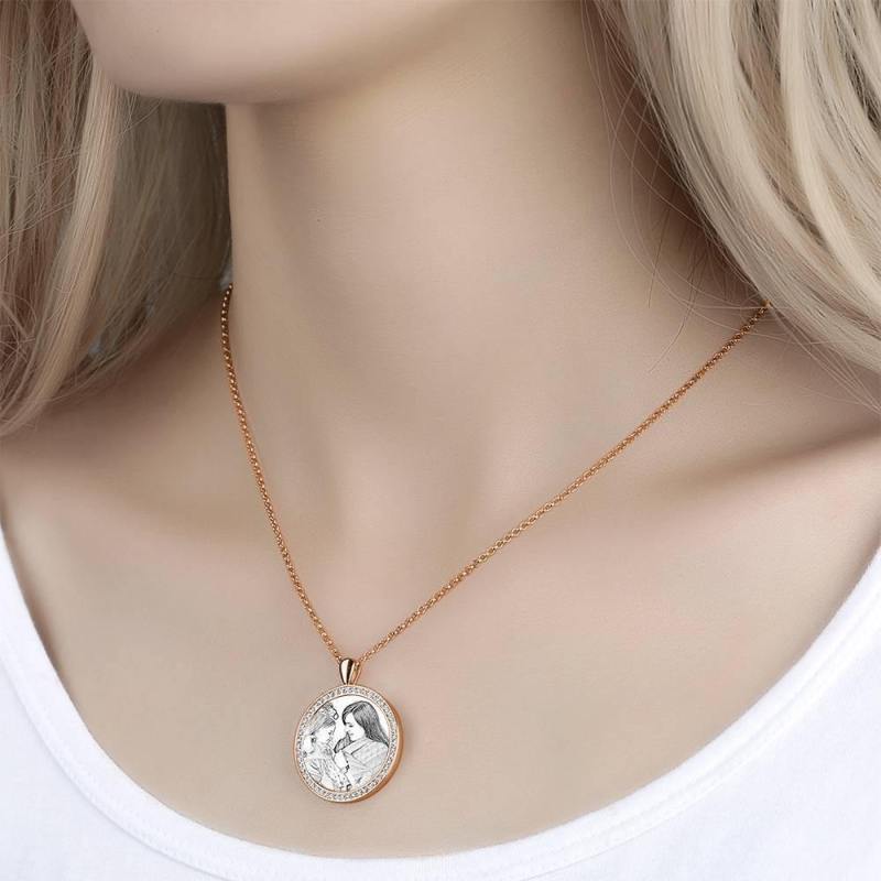 Women's Personalized Photo Engraved Necklace, Rhinestone Crystal Round Shape Photo Necklace Rose Gold Plated - Sketch