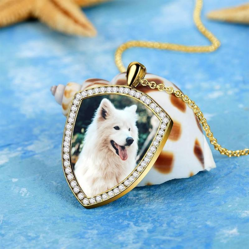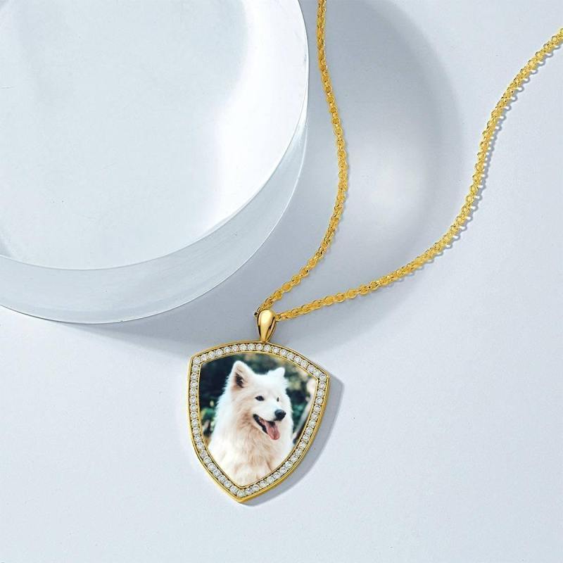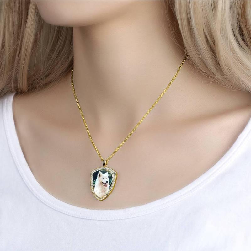 Women's Personalized Photo Engraved Necklace, Rhinestone Crystal Shield Shape Photo Necklace 14K Gold Plated Golden - Colorful